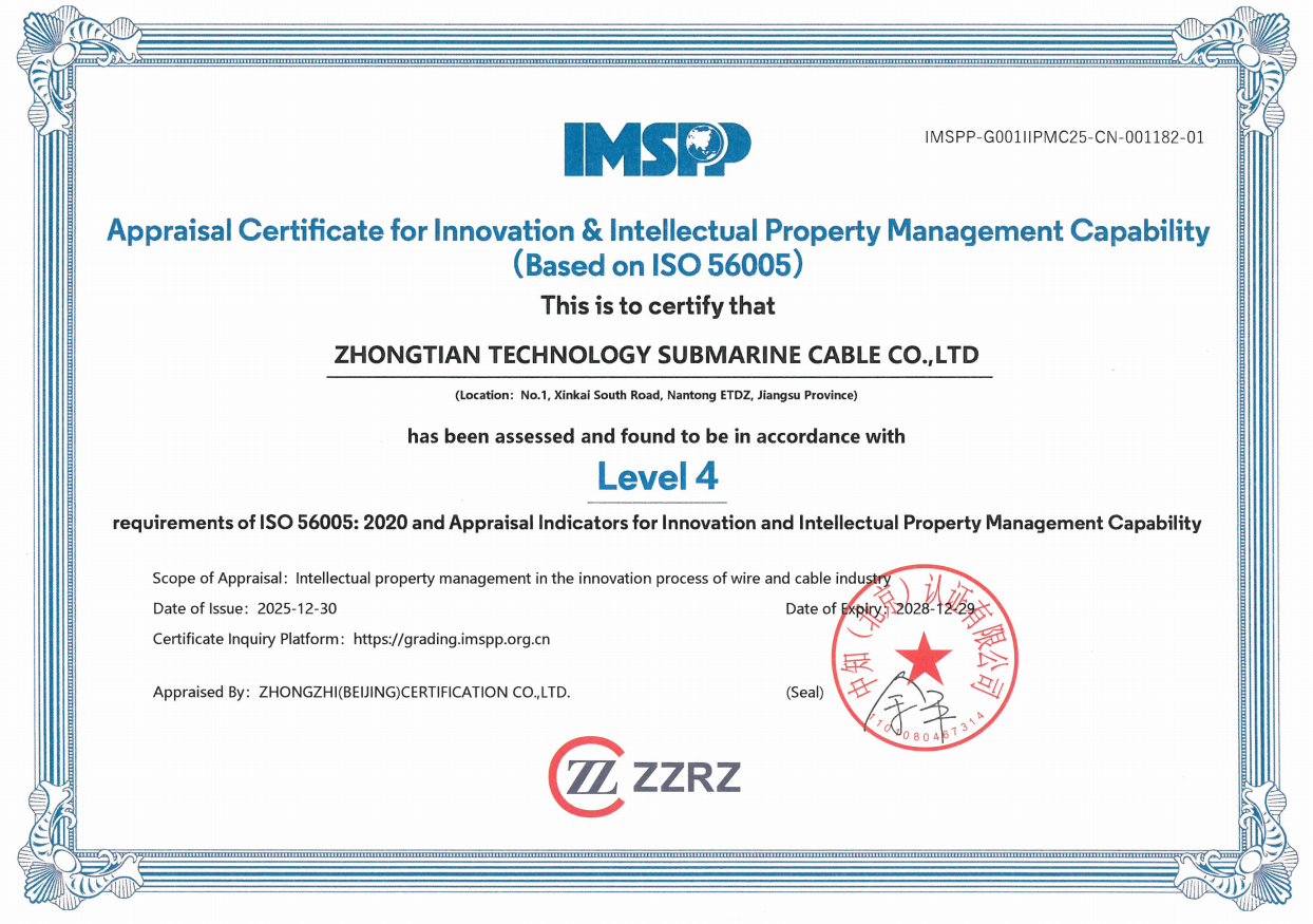 近日,中天科技海缆股份有限公司(以下简称“中天海缆”)通过创新与知识产权管理能力分级评价,成为全国线缆行业首家荣获ISO56005《创新与知识产权管理能力》4级证书的企业,标志着公司在创新与知识产权管理的系统化、国际化水平上取得关键突破。