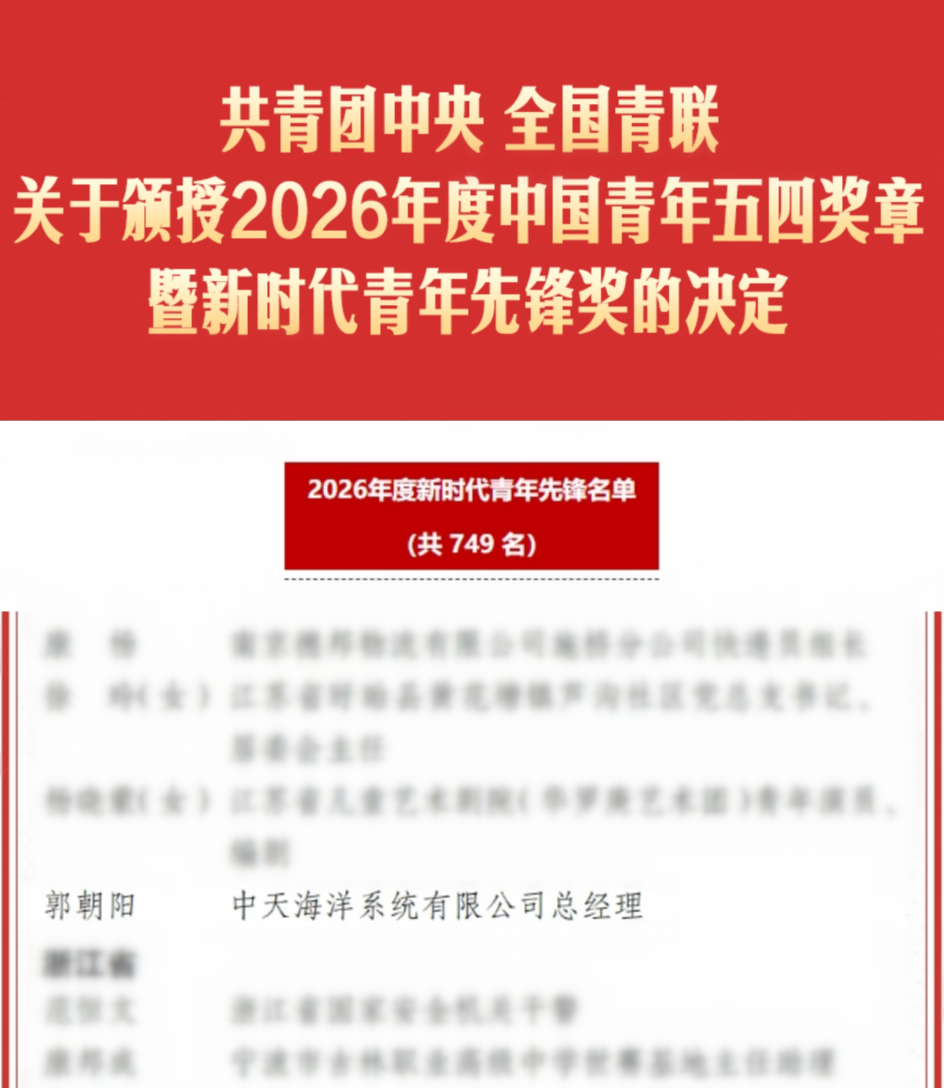 4月27日,共青团中央、全国青联公布《关于颁授2026年度中国青年五四奖章暨新时代青年先锋奖的决定》,中天海洋系统有限公司总经理郭朝阳获授“新时代青年先锋”称号。