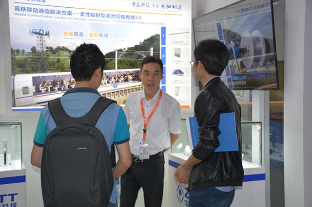 中天射频电缆有限公司总工程师蓝燕锐为客户讲解柔性辐射型同轴漏泄电缆在高铁移动通信解决方案中的应用。